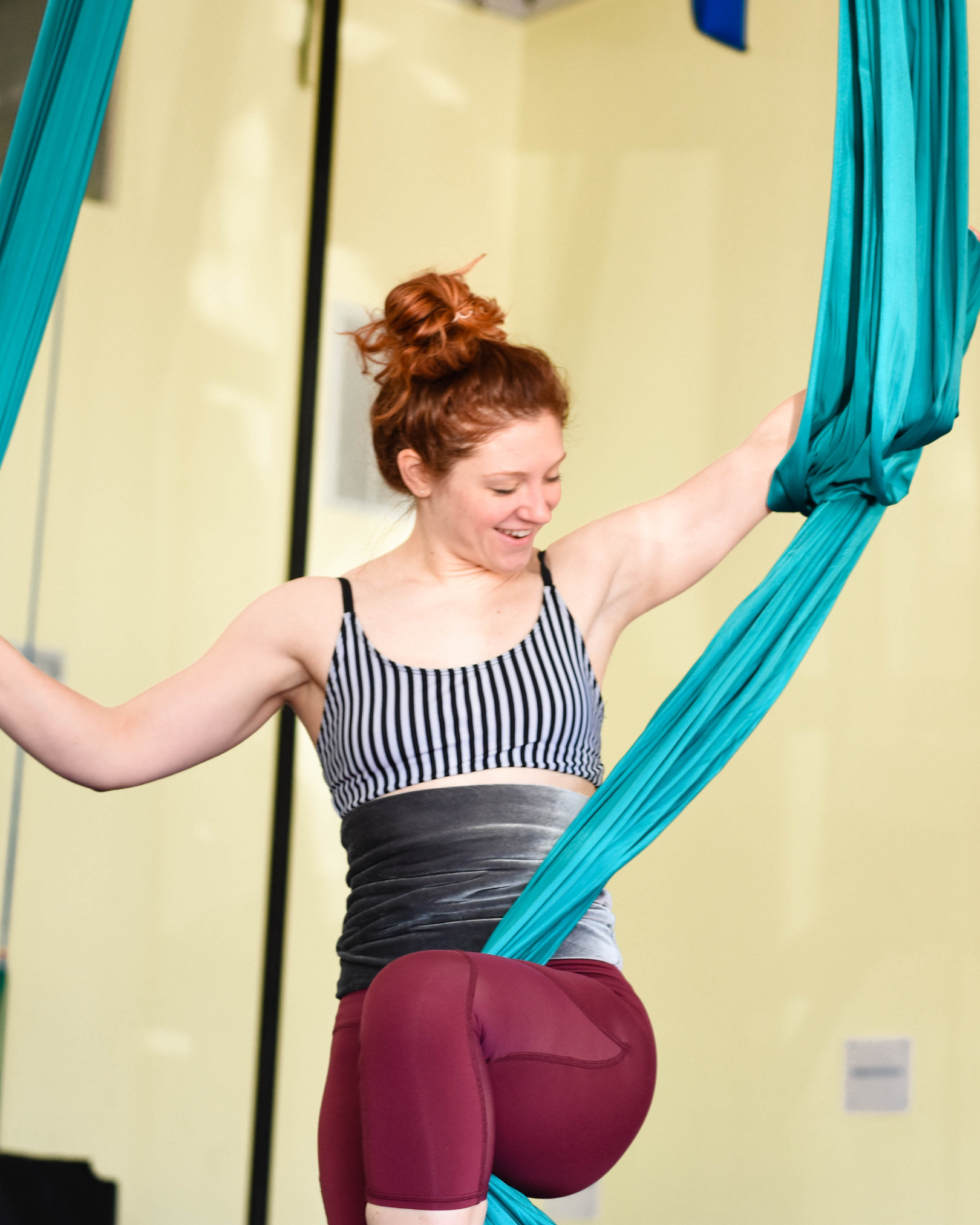 Sling is a mixed level class. We cover the fundamentals of aerial sling as well as offer more advanced moves and sequences. Beginners will learn how to mount, invert and weave through a simple flow while intermediate students learn sequences that build on already existing skills. We work on transitions, shape variations and alternative pathways to challenge the skills and working in sling. Pre-requisites: Have taken our Intro to Silks series or have had prior experience with silks or sling.